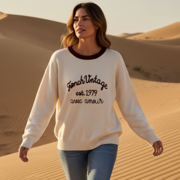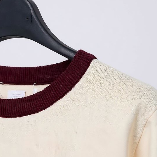 Este jersey de color beige presenta elegantes detalles en burdeos.