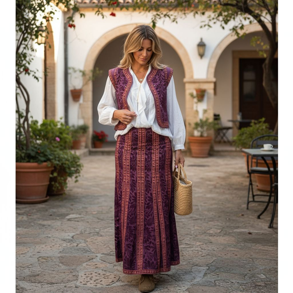 La falda larga de corte recto con estampados geométricos y florales en tonos púrpura y vino es la pieza central, acompañada por un chaleco a juego