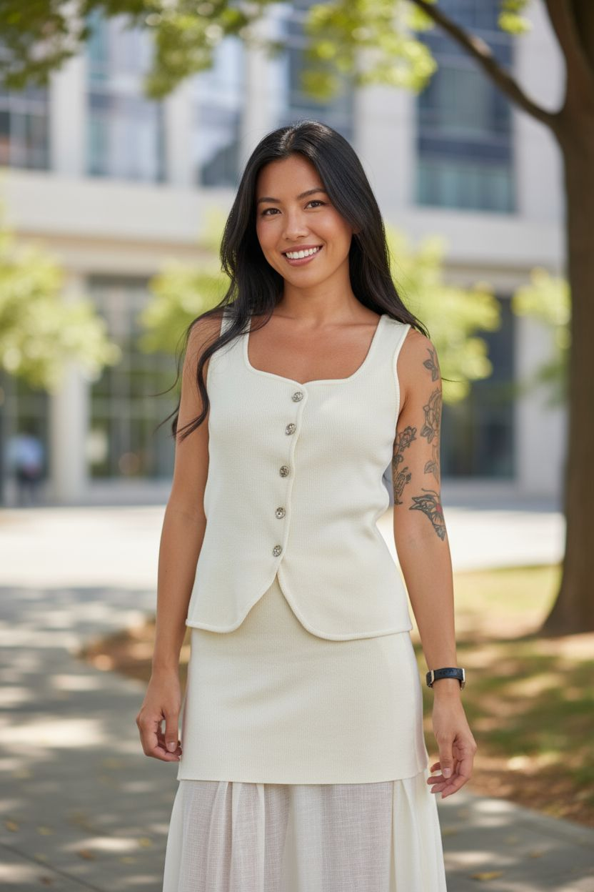 Cierre de botones metálicos en contraste, que aportan un detalle moderno y distintivo. Su tejido de punto ofrece suavidad, elasticidad y una caída natural que se adapta con estilo a la figura.
